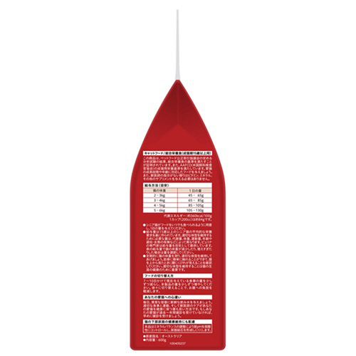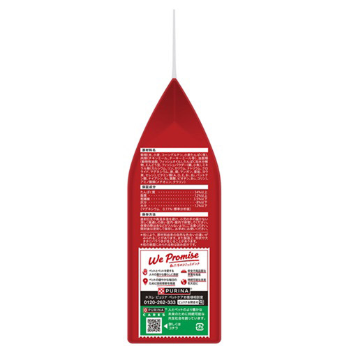 | 素材 | 穀類(米、小麦、コーングルテン、小麦たんぱく 等)、肉類(チキンミール、ターキーミール 等)、油脂類(動物性油脂、フィッシュオイル)、たんぱく加水分解物、えんどう豆、フィッシュパウダー(鯛、小魚)、ミネラル類(カルシウム、リン、カリウム、ナトリウム、クロライド、マグネシウム、鉄、銅、マンガン、亜鉛、ヨウ素、セレン)、ビタミン類(A、D、E、B1、B2、パントテン酸、ナイアシン、B6、葉酸、ビオチン、B12、コリン)、アミノ酸類(メチオニン、タウリン) |