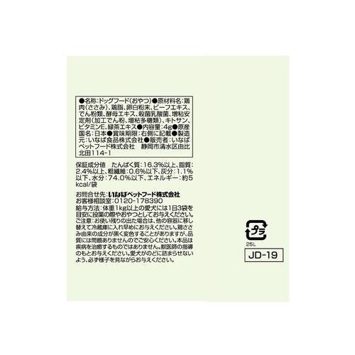 鶏肉(ささみ)、鶏脂、卵白粉末、ビーフエキス、でん粉類、酵母エキス、殺菌乳酸菌、増粘安定剤(加工でん粉、増粘多糖類)、キトサン、ビタミンE、緑茶エキス