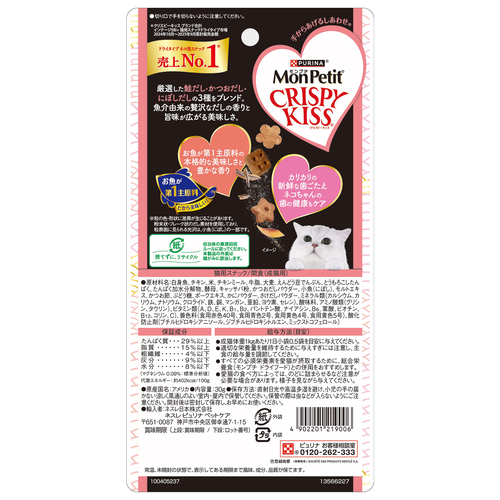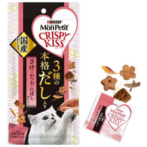 お魚を第1主原料に使用した、香り広がるクリスピーなおやつ。厳選した鮭だし・かつおだし・にぼしだしの3種をブレンド。魚介由来の贅沢なだしの香りと旨味が広がる美味しさ。