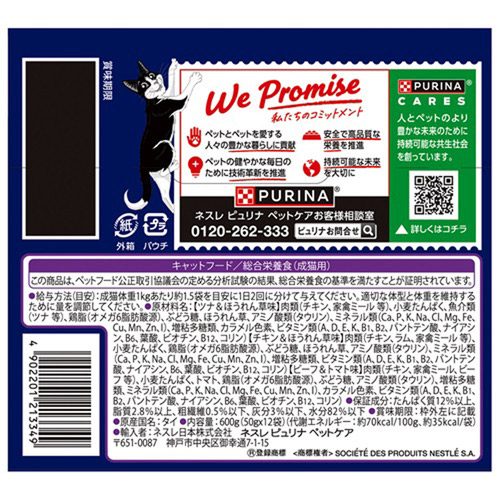 | 素材 | 【ツナ&ほうれん草味】肉類(チキン、家禽ミール等)、小麦たんぱく、魚介類(ツナ等)、鶏脂(オメガ6脂肪酸源)、ぶどう糖、ほうれん草、アミノ酸類(タウリン)、ミネラル類(Ca、P、K、Na、Cl、Mg、Fe、Cu、Mn、Zn、I)、増粘多糖類、カラメル色素、ビタミン類(A、D、E、K、B1、B2、パントテン酸、ナイアシン、B6、葉酸、ビオチン、B12、コリン)【チキン&ほうれん草味】肉類(チキン、ラム、家禽ミール等)、小麦たんぱく、鶏脂(オメガ6脂肪酸源)、ぶどう糖、ほうれん草、アミノ酸類(タウリン)、ミネラル類(Ca、P、K、Na、Cl、Mg、Fe、Cu、Mn、Zn、I)、増粘多糖類、ビタミン類(A、D、E、K、B1、B2、パントテン酸、ナイアシン、B6、葉酸、ビオチン、B12、コリン)【ビーフ&トマト味】肉類(チキン、家禽ミール、ビーフ等)、小麦たんぱく、トマト、鶏脂(オメガ6脂肪酸源)、ぶどう糖、アミノ酸類(タウリン)、増粘多糖類、ミネラル類(Ca、P、K、Na、Cl、Mg、Fe、Cu、Mn、Zn、I)、カラメル色素、ビタミン類(A、D、E、K、B1、B2、パントテン酸、ナイアシン、B6、葉酸、ビオチン、B12、コリン) |