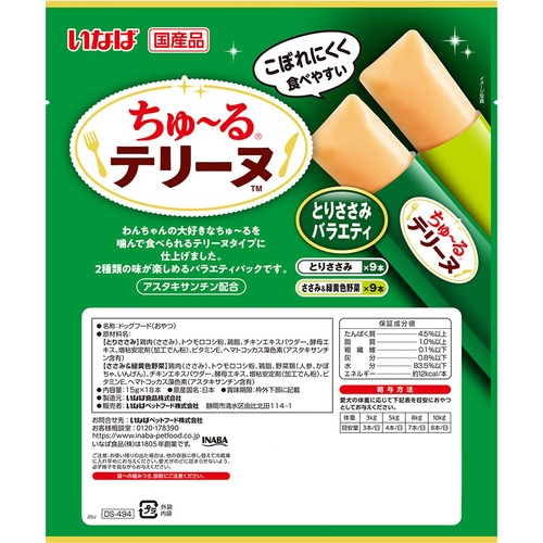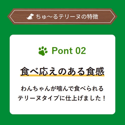 わんちゃんの大好きなちゅ~るを噛んで食べられるテリーヌタイプに仕上げました。ほろっと崩れる自然な固さで、こぼれにくく食べやすい。2種類の味が楽しめるバラエティパック。