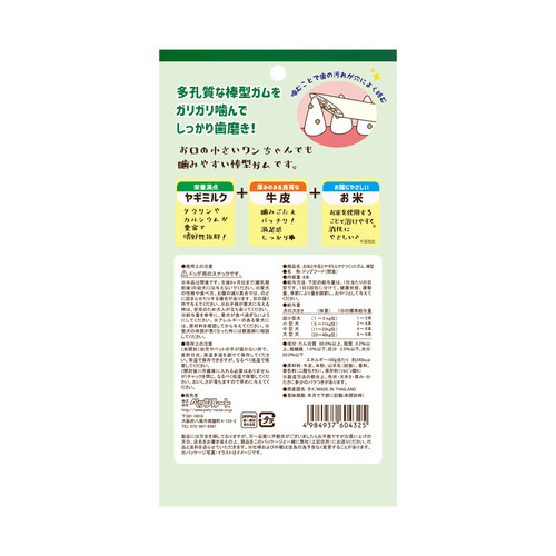 多孔質な棒型ガムをガリガリ噛んでしっかり歯みがき!栄養満点なヤギミルクと厚みのある良質な牛皮をお腹にやさしいお米でしっかり固めました。