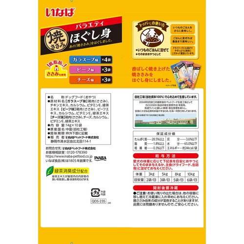 好評の焼ささみをほぐし身にした犬用おやつが登場素材の旨味を逃さず焼き上げた焼ささみをほぐし身にしました。いつものごはんに混ぜていただくことで美味しさプラス。3種類の味が楽しめるバラエティパック。