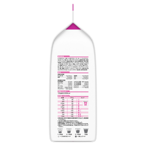 | 素材 | 小麦、とうもろこし、トリ肉(チキン、ターキー)、エンドウマメ、セルロース、オーツ麦、大麦、チキンエキス、動物性油脂、亜麻仁、ビートパルプ、植物性油脂、フラクトオリゴ糖、米、加水分解豚軟骨、加水分解甲殻類、ミネラル類(カルシウム、ナトリウム、カリウム、クロライド、銅、鉄、マンガン、セレン、亜鉛、イオウ、ヨウ素)、乳酸、アミノ酸類(タウリン、メチオニン、リジン)、ビタミン類(A、B1、B2、B6、B12、C、D3、E、ベータカロテン、ナイアシン、パントテン酸、葉酸、ビオチン、コリン)、L-カルニチン、酸化防止剤(ミックストコフェロール、ローズマリー抽出物、緑茶抽出物) |