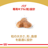 ●パグは短頭種で短い顎が特徴です。特別に開発されたキブル(粒)の形、大きさ、食感は、独特な形状の顎でも捉えやすく、噛むことを促します。