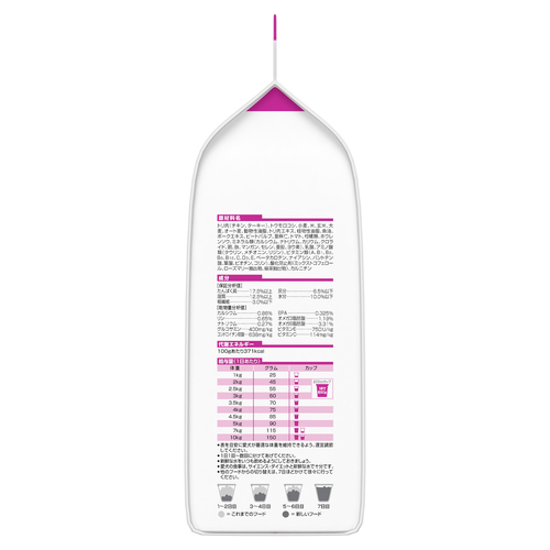 | 素材 | トリ肉(チキン、ターキー)、米、小麦、とうもろこし、玄米、動物性油脂、オーツ麦、大麦、トリ肉エキス、ビートパルプ、植物性油脂、魚油、亜麻仁、ポークエキス、フラクトオリゴ糖、トマト、柑橘類、ホウレンソウ、ミネラル類(カルシウム、ナトリウム、カリウム、クロライド、銅、鉄、マンガン、セレン、亜鉛、イオウ、ヨウ素)、乳酸、アミノ酸類(タウリン、トリプトファン、メチオニン、リジン)、ビタミン類(A、B1、B2、B6、B12、C、D3、E、ベータカロテン、ナイアシン、パントテン酸、葉酸、ビオチン、コリン)、L-カルニチン、酸化防止剤(ミックストコフェロール、ローズマリー抽出物、緑茶抽出物) |