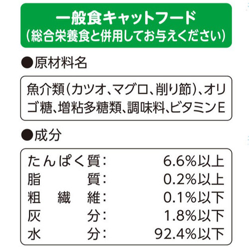 魚介類(カツオ、マグロ、削り節)、オリゴ糖、増粘多糖類、調味料、ビタミンE |
