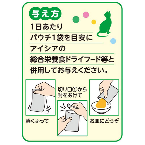 ●与え方/1日あたりパウチ1袋を目安にアイシアの総合栄養食ドライフード等と併用してお与えください。