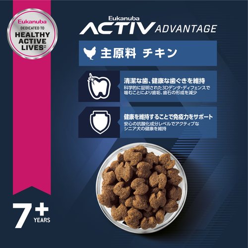 | 素材 | 肉類(鶏、七面鳥)、小麦、とうもろこし、とうもろこし粉、大麦、動物性脂肪、ビートパルプ、加水分解レバー(鶏、七面鳥)、酵母および酵母エキス、魚油(DHA源)、フラクトオリゴ糖、グルコサミン、加水分解軟骨(コンドロイチン硫酸源)、アミノ酸類(DL-メチオニン)、ポリリン酸ナトリウム、β-カロテン、ミネラル類(Cl、Na、K、Ca、Zn、Mn、Fe、Cu、I、Se)、ビタミン類(A、D3、コリン、E、パントテン酸カルシウム、ナイアシン、B6、B1、B2、ビオチン、葉酸、B12)、保存料(ソルビン酸カリウム)、酸化防止剤(ミックストコフェロール、ローズマリーエキス) |