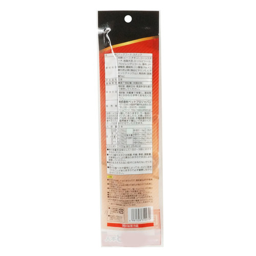 肉類(ビーフ、チキン)、コーンスターチ、脱脂大豆、Dーソルビトール、グリセリン、香料、乳酸Na、pH調整剤、調味料、リン酸塩(Na、K)、酸化防止剤(抽出ビタミンE、ビタミンCナトリウム)、発色剤(亜硝酸Na) |