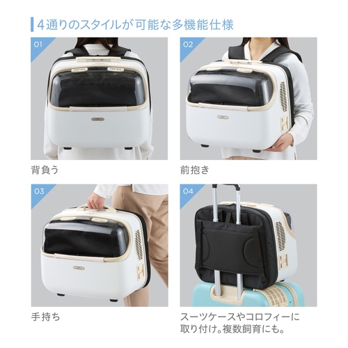背負う、前抱き、手持ち、スーツケースやOSOTOコロフィー(別売)に取り付け可能。
