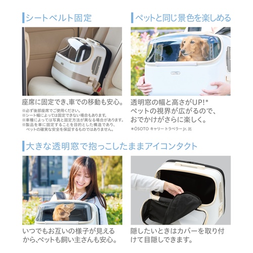 ペットと同じ景色を楽しめる大きな透明窓なので、抱っこしたままアイコンタクト。