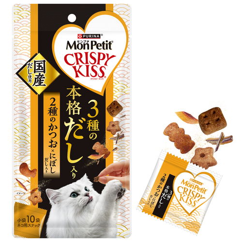 お魚を第1主原料に使用した、香り広がるクリスピーなおやつ。厳選した2種のかつおだしとにぼしだしをブレンド。魚介由来の贅沢なだしの香りと旨味が広がる美味しさ。