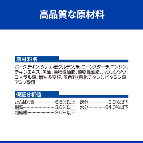 ポーク、チキン、ツナ、小麦グルテン、米、コーンスターチ、ニンジン、チキンエキス、魚油、動物性油脂、植物性油脂、ホウレンソウ、ミネラル類、増粘多糖類、着色料(酸化チタン)、ビタミン類、アミノ酸類 |