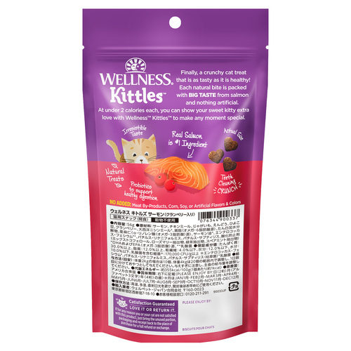 厳選自然素材を使用したご褒美おやつ。第一原材料にサーモンを使用。小麦、とうもろこし、米、大豆などの穀物、鶏、七面鳥等の家禽類の頭、足、腸といった家禽副産物、人口着色料、着色料、保存料不使用。カリカリとした粒を嚙むことで歯垢が蓄積しないようサポート。