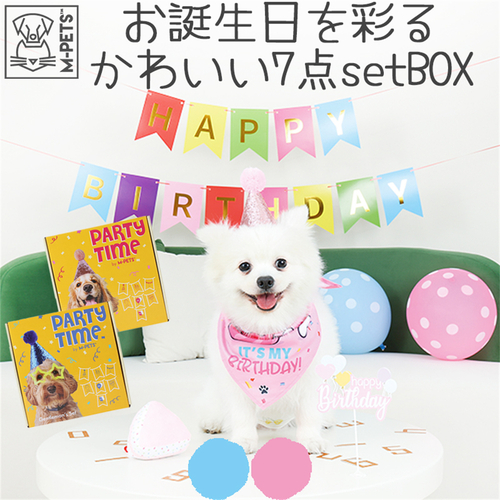 ・お誕生日を彩るかわいい7点セットボックス。愛犬のお誕生日をかわいく飾りつけしてお祝いできる、POPでかわいいアイテムがぎっしり詰まったパーティーグッズセットです。