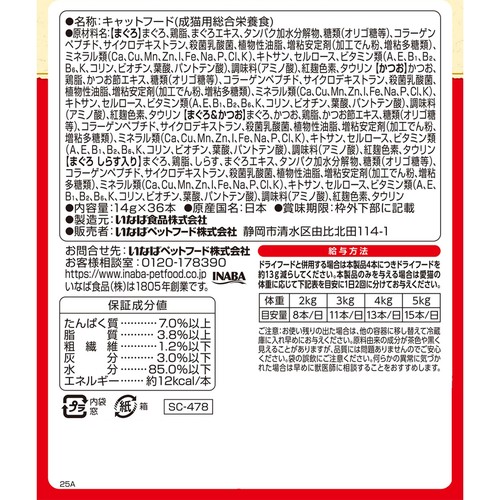 | 成分 | たんぱく質…7.0%以上、脂質…3.8%以上、粗繊維…1.2%以下、灰分…3.0%以下、水分…85.0%以下、エネルギー…約12kcal/本 |