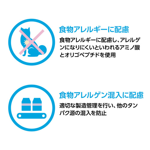 この食事は、食物アレルギーによる皮膚疾患および消化器疾患の犬に配慮し、アレルゲンになりにくいといわれるアミノ酸とオリゴペプチドを使用しています。
