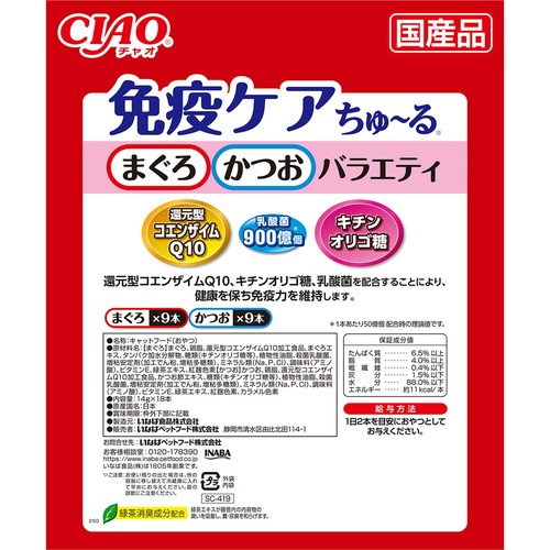 | 素材 | 【まぐろ味】まぐろ、鶏脂、還元型コエンザイムQ10加工食品、まぐろエキス、タンパク加水分解物、糖類(キチンオリゴ糖等)、植物性油脂、殺菌乳酸菌、増粘安定剤(加エでん粉、増粘多糖類)、ミネラル類(Na、P、Cl)、調味料(アミノ酸)、ビタミンE、緑茶エキス、紅麹色素【とりささみ味】鶏肉(ささみ)、鶏脂、還元型コエンザイムQ10加工食品、ほたてエキス、糖類(キチンオリゴ糖等)、植物性油脂、殺菌乳酸菌、増粘安定剤(加エでん粉、増粘多糖類)、ミネラル類(Na、P、Cl)、調味料(アミノ酸)、ビタミンE、緑茶エキス、カラメル色素、カロテノイド色素 |