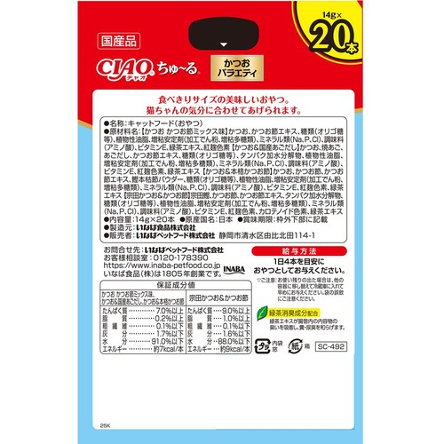 | 成分 | たんぱく質…7.0%以上、脂質…4.0%以上、粗繊維…0.3%以下、灰分…2.5%以下、水分…86.2%以下、エネルギー…約12kcal/本 |