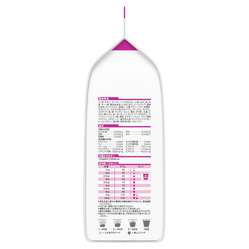 | 素材 | トリ肉(チキン、ターキー)、とうもろこし、小麦、玄米、米、大麦、オーツ麦、動物性油脂、トリ肉エキス、ビートパルプ、植物性油脂、ポークエキス、亜麻仁、フラクトオリゴ糖、トマト、柑橘類、ホウレンソウ、ミネラル類(カルシウム、ナトリウム、カリウム、クロライド、銅、鉄、マンガン、セレン、亜鉛、イオウ、ヨウ素)、乳酸、ビタミン類(A、B1、B2、B6、B12、C、D3、E、ベータカロテン、ナイアシン、パントテン酸、葉酸、ビオチン、コリン)、L-カルニチン、アミノ酸類(タウリン、メチオニン)、酸化防止剤(ミックストコフェロール、ローズマリー抽出物、緑茶抽出物) |