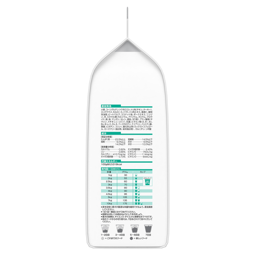 | 素材 | 小麦、トリ肉(チキン、ターキー)、エンドウマメ、小麦グルテン、とうもろこし、セルロース、トマト、トリ肉エキス、動物性油脂、亜麻仁、ビートパルプ、ココナッツ油、ポークエキス、ニンジン、米、ミネラル類(カルシウム、ナトリウム、カリウム、クロライド、銅、鉄、マンガン、セレン、亜鉛、イオウ、ヨウ素)、アミノ酸類(タウリン、メチオニン、リジン)、乳酸、ビタミン類(A、B1、B2、B6、B12、C、D3、E、ベータカロテン、ナイアシン、パントテン酸、葉酸、ビオチン、コリン)、L-カルニチン、酸化防止剤(ミックストコフェロール、ローズマリー抽出物、緑茶抽出物) |