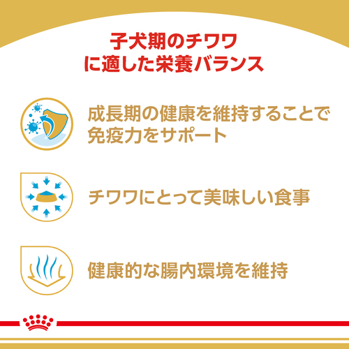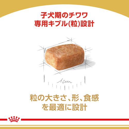 ●成長期のチワワの小さなあごでも簡単に捉えられて、しっかりと噛めるように設計された、最適な大きさ、形、食感のキブル(粒)です。
